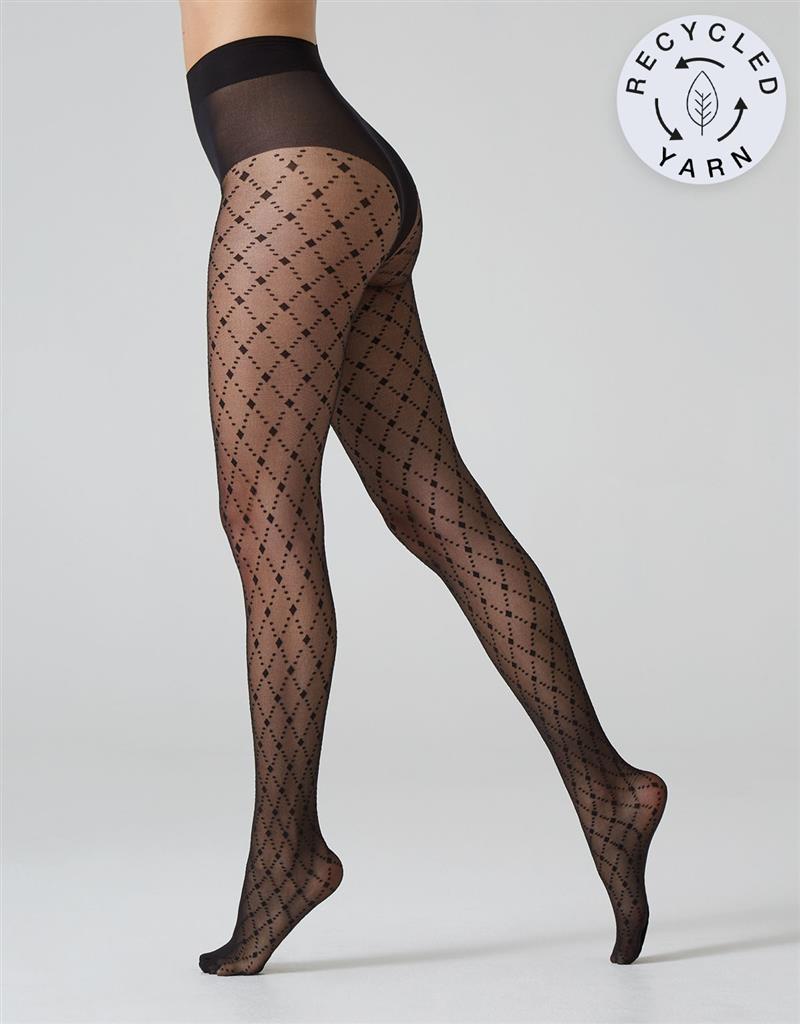 20 den zeķubikses ar rakstu, izgatavotas no augstas kvalitātes, pārstrādātiem, ekoloģiskiem diegiem. Sofistiskotais dimanta raksts nodrošina modernu, elegantu izskatu. Ar kokvilnas starpliku, bikini apakšveļu un pastiprinātiem purngaliem.