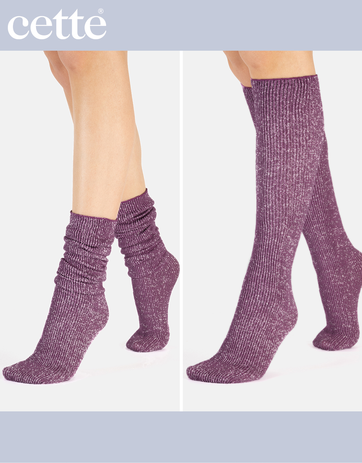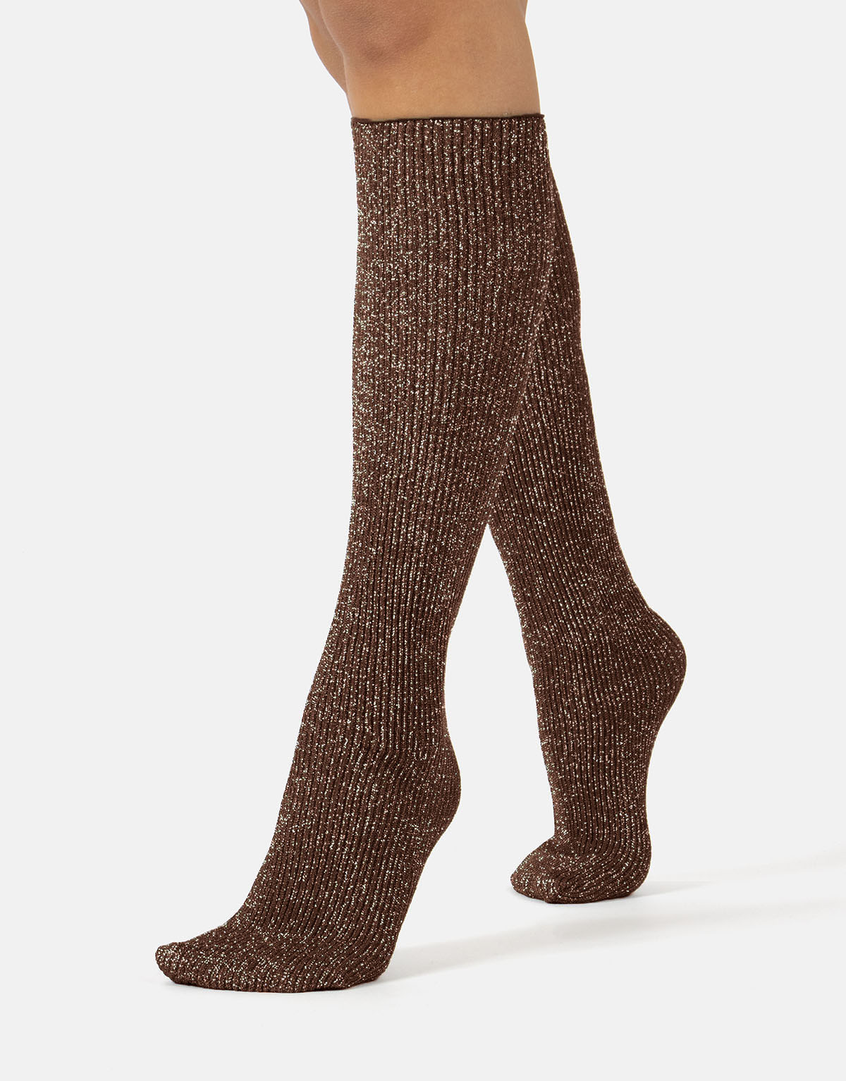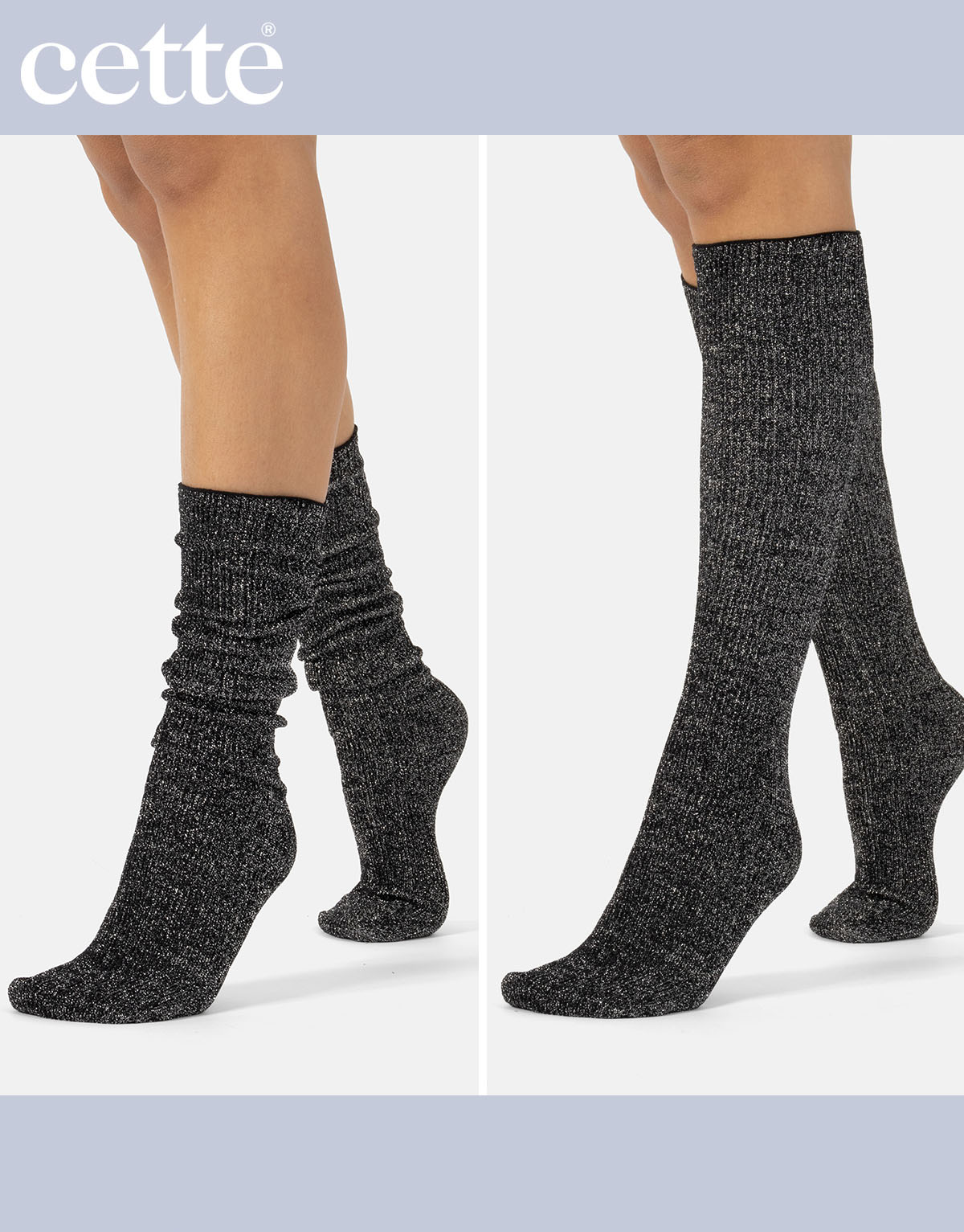 Glamorīgs spīdums uz šo modes zeķu virsmas liks jums mirdzēt kā zvaigzne katrā īpašā gadījumā. Šīm garajām zeķēm ir rievots raksts visā garumā no purngaliem līdz augšai. Monohromā dzija satiekas ar sudraba spīdīgo dziju, un kopā tās rada fascinējošu un acīmredzamu zeķu aksesuāru. Turklāt šīs garās zeķes ir ļoti ērtas, jo tām ir vaļēja augšdaļa. Tā kā tām nav elastīgās jostasvietas, tās var valkāt, kā vēlaties: nospiestas uz leju smagās krokās ap potītēm vai uzvilkt līdz ceļiem. Pateicoties to elastīgajai un rievotajai audumam, kad tās uzvelk, šīs fantastiskās zeķes nekrīt, bet paliek savā vietā pat tad, kad jūs pārvietojaties. Mēģiniet tās kā vaļīgas zeķes, sarullētas ap potītēm ar lielu T-kreklu, lai iegūtu jauku ikdienišķu izskatu, vai uzvilkt ar elegantu svinīgu izskatu: jūs netiksiet pamanīti.