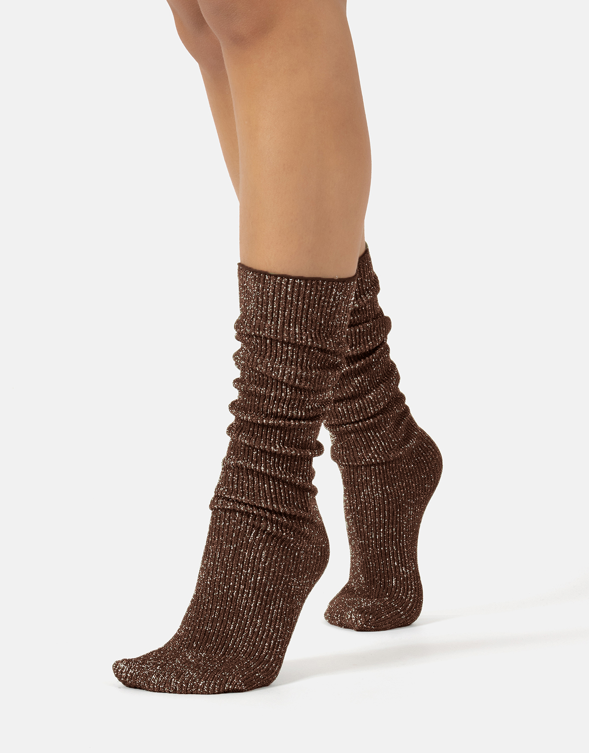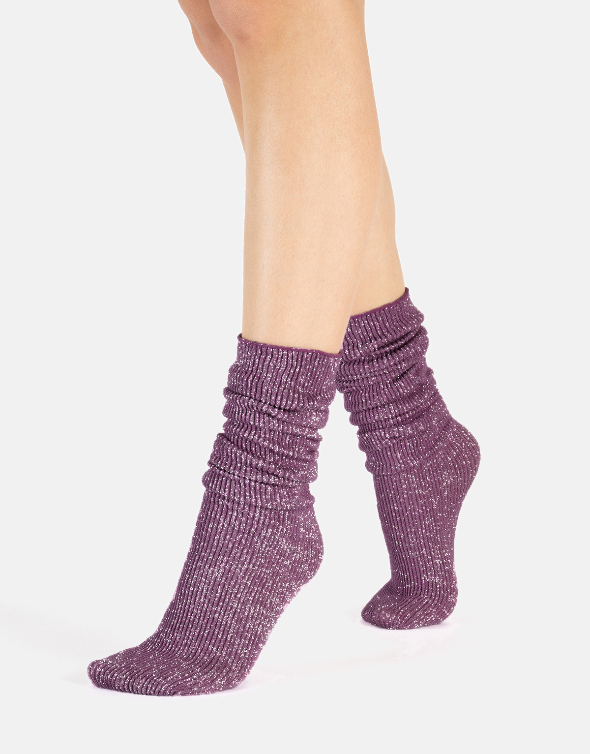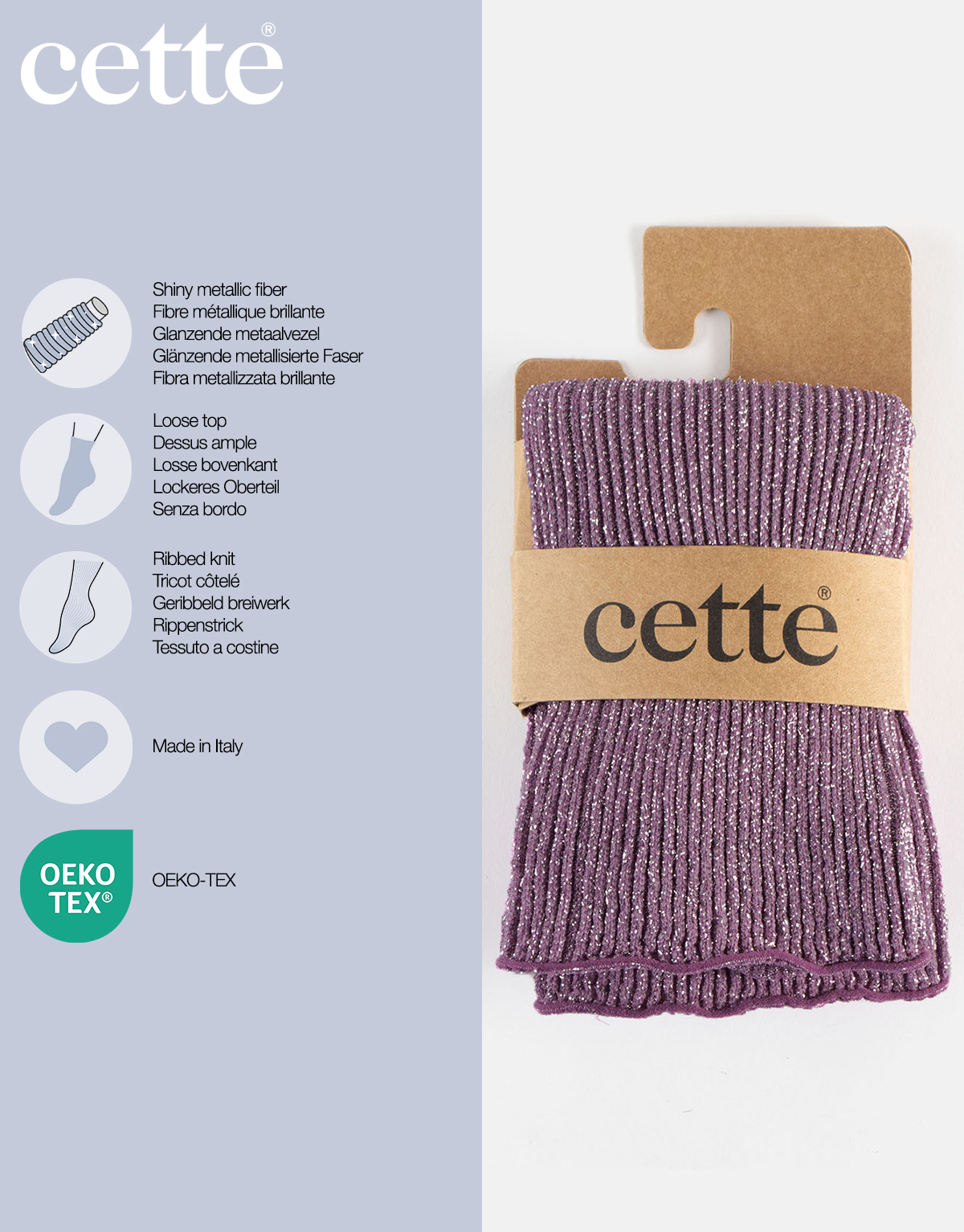 Glamorīgs spīdums uz šo modes zeķu virsmas liks jums mirdzēt kā zvaigzne katrā īpašā gadījumā. Šīm garajām zeķēm ir rievots raksts visā garumā no purngaliem līdz augšai. Monohromā dzija satiekas ar sudraba spīdīgo dziju, un kopā tās rada fascinējošu un acīmredzamu zeķu aksesuāru. Turklāt šīs garās zeķes ir ļoti ērtas, jo tām ir vaļēja augšdaļa. Tā kā tām nav elastīgās jostasvietas, tās var valkāt, kā vēlaties: nospiestas uz leju smagās krokās ap potītēm vai uzvilkt līdz ceļiem. Pateicoties to elastīgajai un rievotajai audumam, kad tās uzvelk, šīs fantastiskās zeķes nekrīt, bet paliek savā vietā pat tad, kad jūs pārvietojaties. Mēģiniet tās kā vaļīgas zeķes, sarullētas ap potītēm ar lielu T-kreklu, lai iegūtu jauku ikdienišķu izskatu, vai uzvilkt ar elegantu svinīgu izskatu: jūs netiksiet pamanīti.