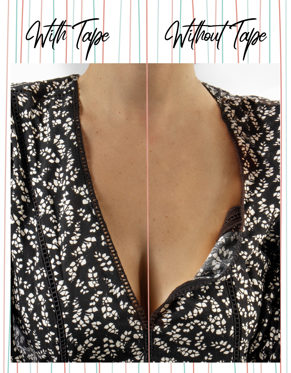 These adhesive stripes have a multitude of possible uses, they can secure clothes to the skin in case of deep plunge, open-sided dresses, wrap-style tops, but they can also stick parts of fabrics, in case of gaps between buttons, open hems, bra straps or shoulder pads.