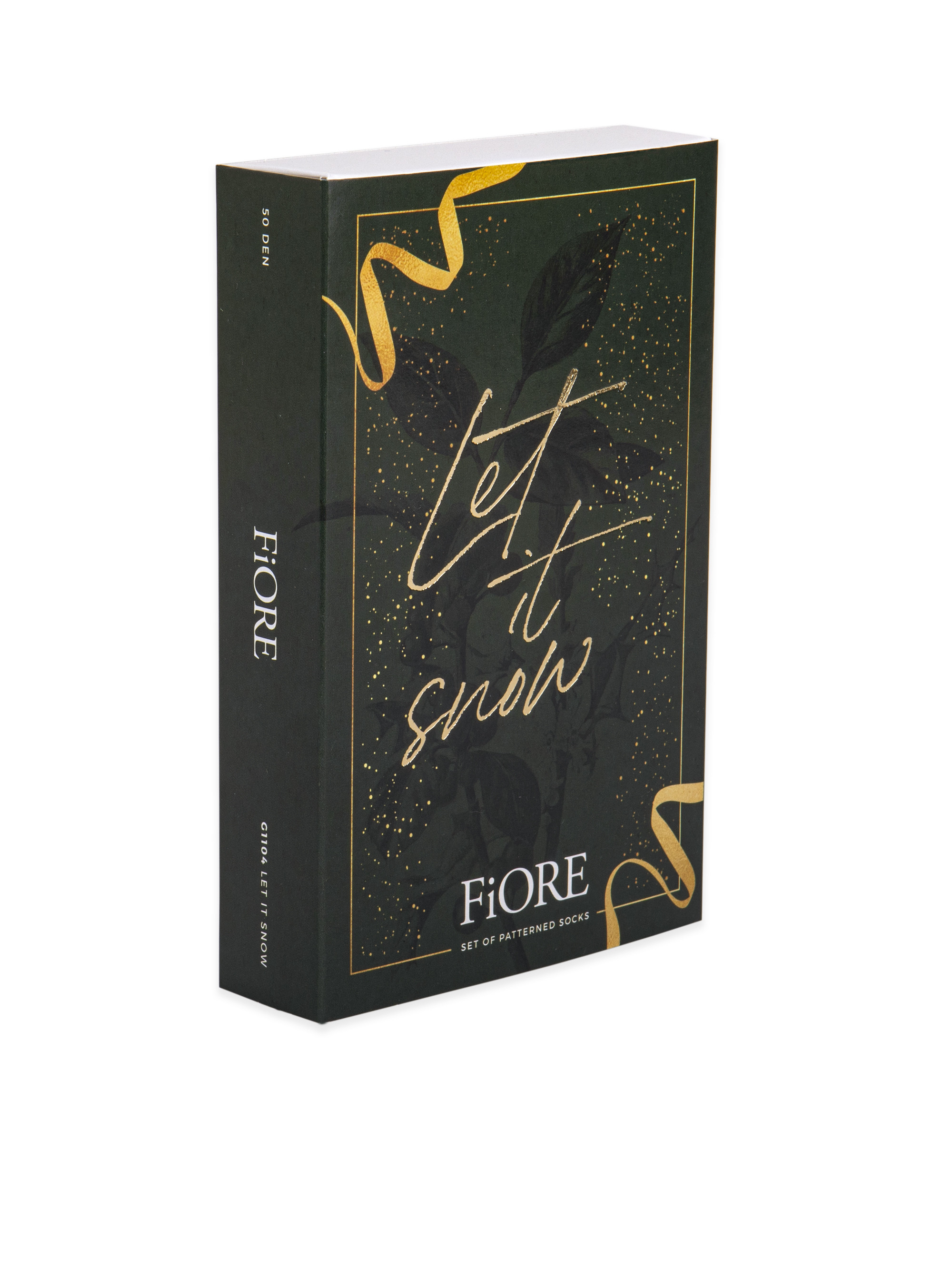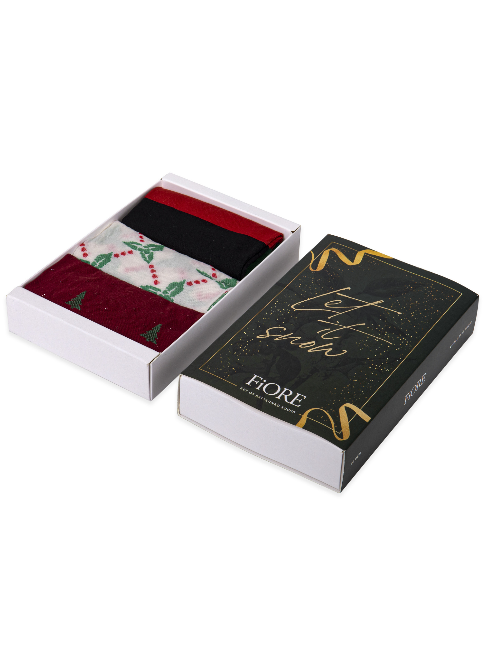 Maģisks zeķīšu komplekts! Šajā rakstainajā zeķīšu komplektā atradīsiet trīskāršu Ziemassvētku iedvesmu. Delikāti holly lapas, Ziemassvētku eglītes uz svinīga sarkana fona ar spīdīgiem punktiem kā sniegpārslas un sudraba apmale uz aproces, un izteiksmīgas zeķītes trīs piesātinātās krāsās. Kad ārā snieg, ģērbieties svinīgi un izmēģiniet visus variantus. Dāvanu kaste - viss iepakots atmosfēriskā, Ziemassvētku kastē.