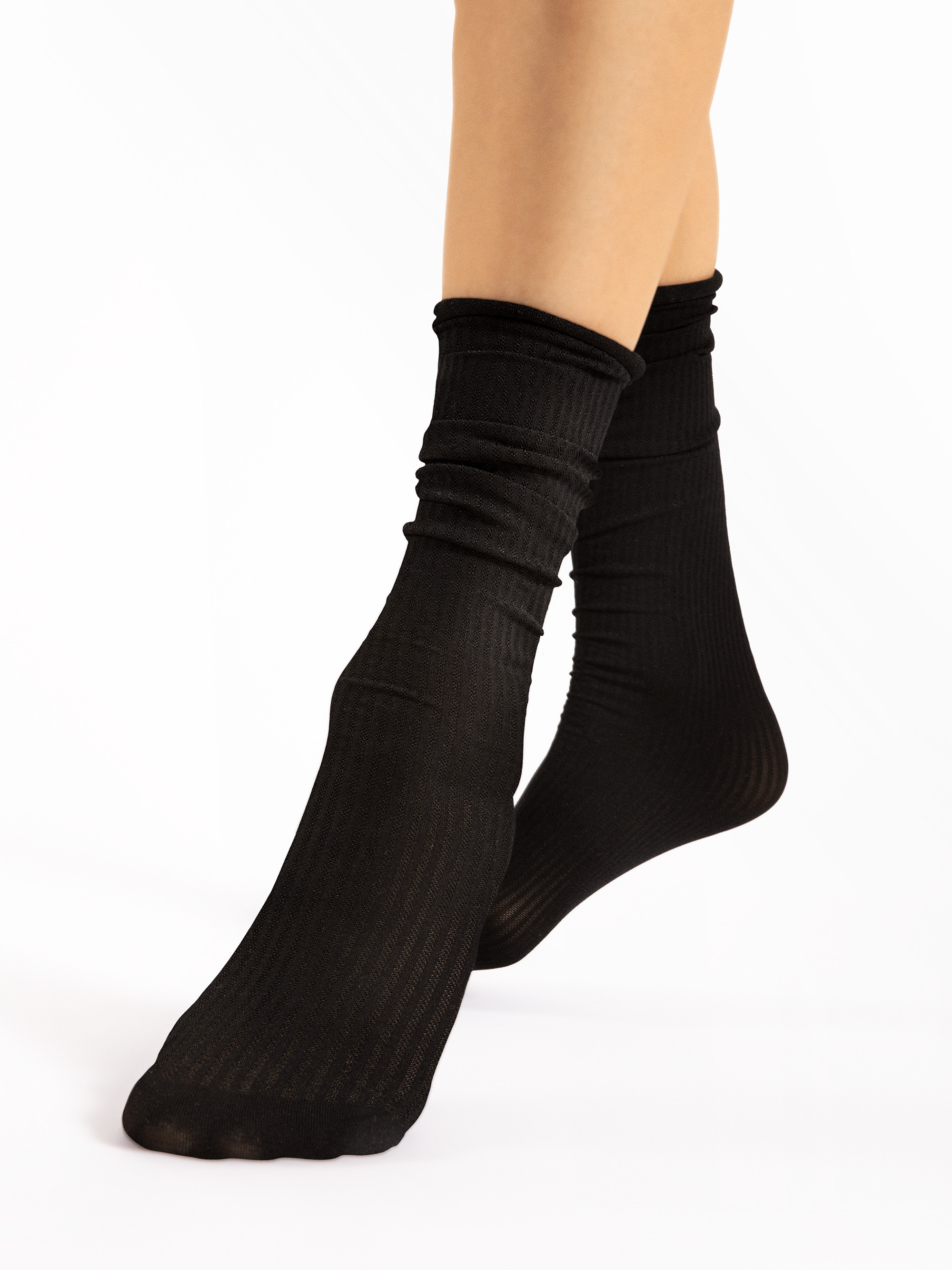 Garās zeķes ar matētu-spīdīgu, rievotu izskatu. Bez aproces, ar modernu plūstošu efektu.