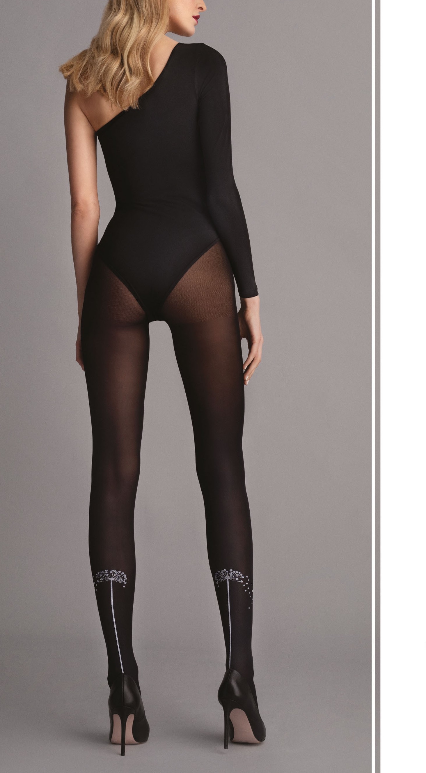 Pusscaurspīdīgas zeķubikses ar puķu rakstu un vīles imitāciju, kas palīdz slaidākam un garākam izskatam, 40 den.