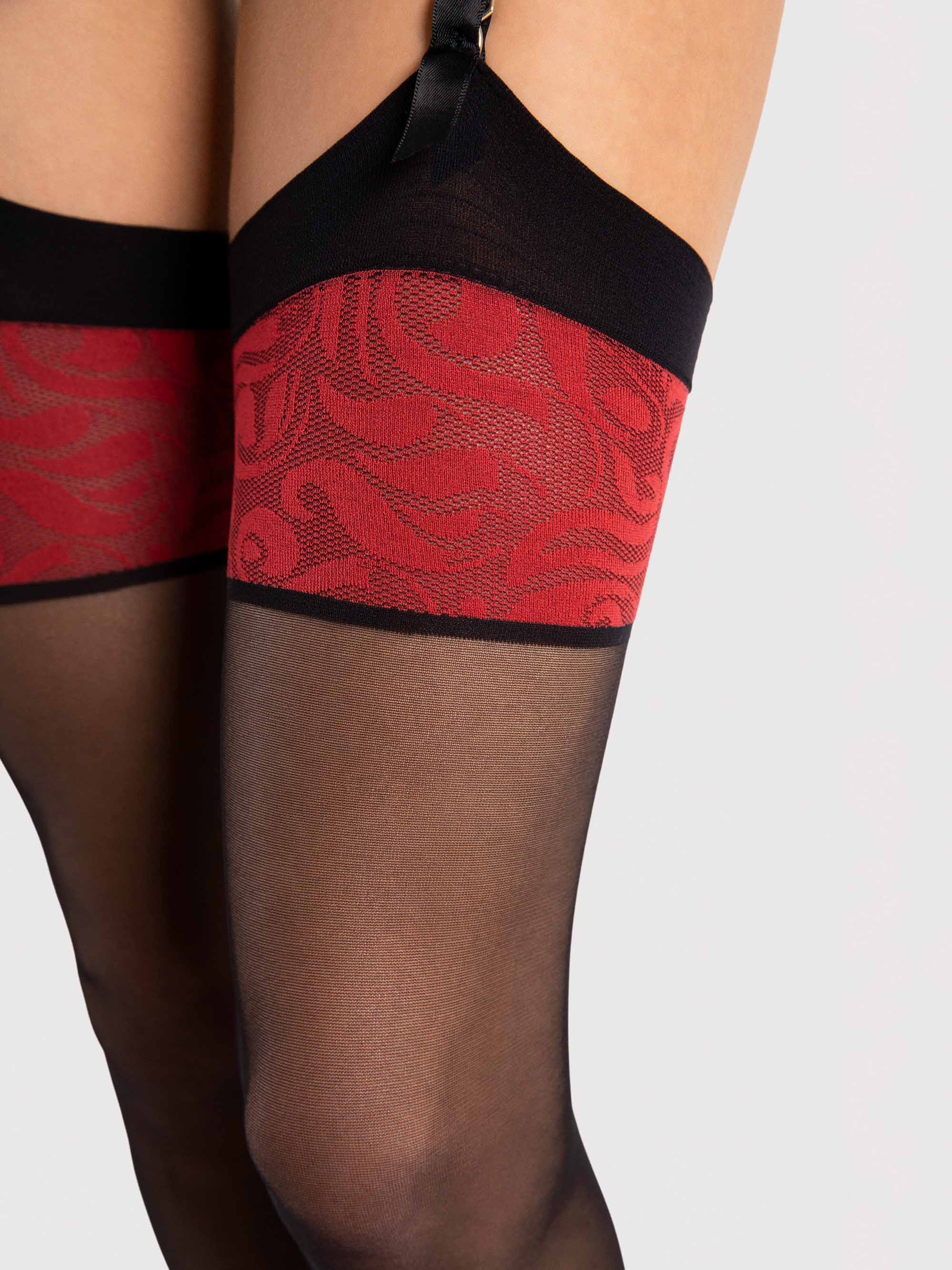 Fiore - 20 den zeķes ar sarkanu puķu rakstu un plakanas jostas ar svītrām