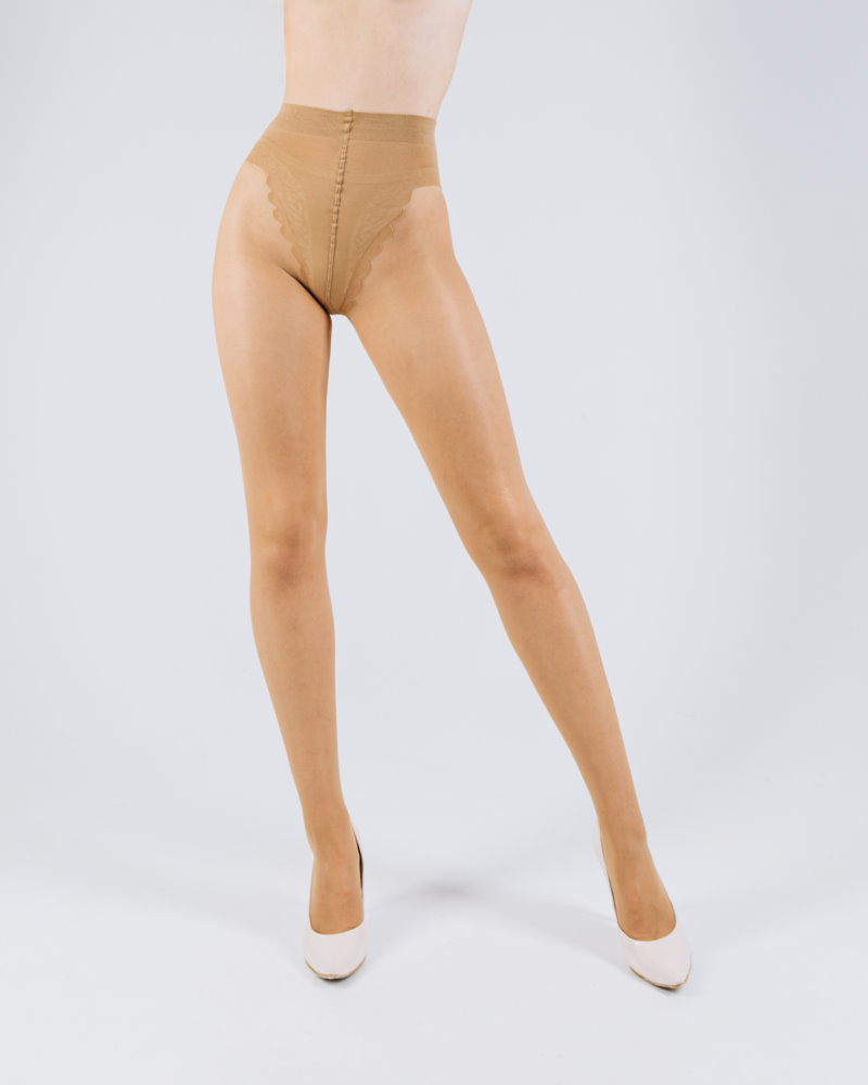 Zeķubikses ar vīli un elegantu, augsta griezuma mežģīņu dizaina biksītēm, ar atvērtu purngalu, plakanām šuvēm un kokvilnas ieliktni, 20 den.