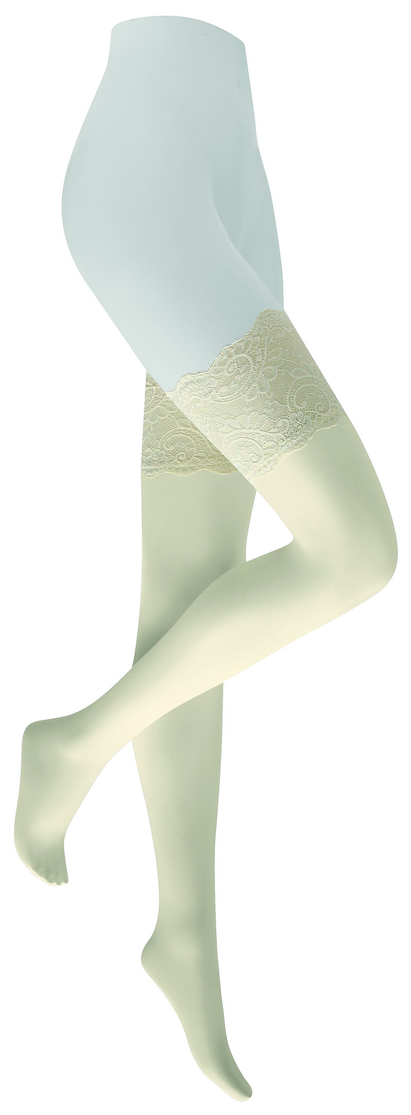 Pašpieturošās zeķes, caurspīdīgas, spīdīgas, stilīga mežģīņu apmale ar plakanām šuvēm, kājas stilīgā briljanta izskatā, ēnas purngals ar mīkstu plakanām šuvēm, pielāgota papēža daļa, nav pastiprināta. Baltā un ivorija krāsā ideālas kāzu pašpieturošās zeķes! 90% poliamīds, 10% elastāns