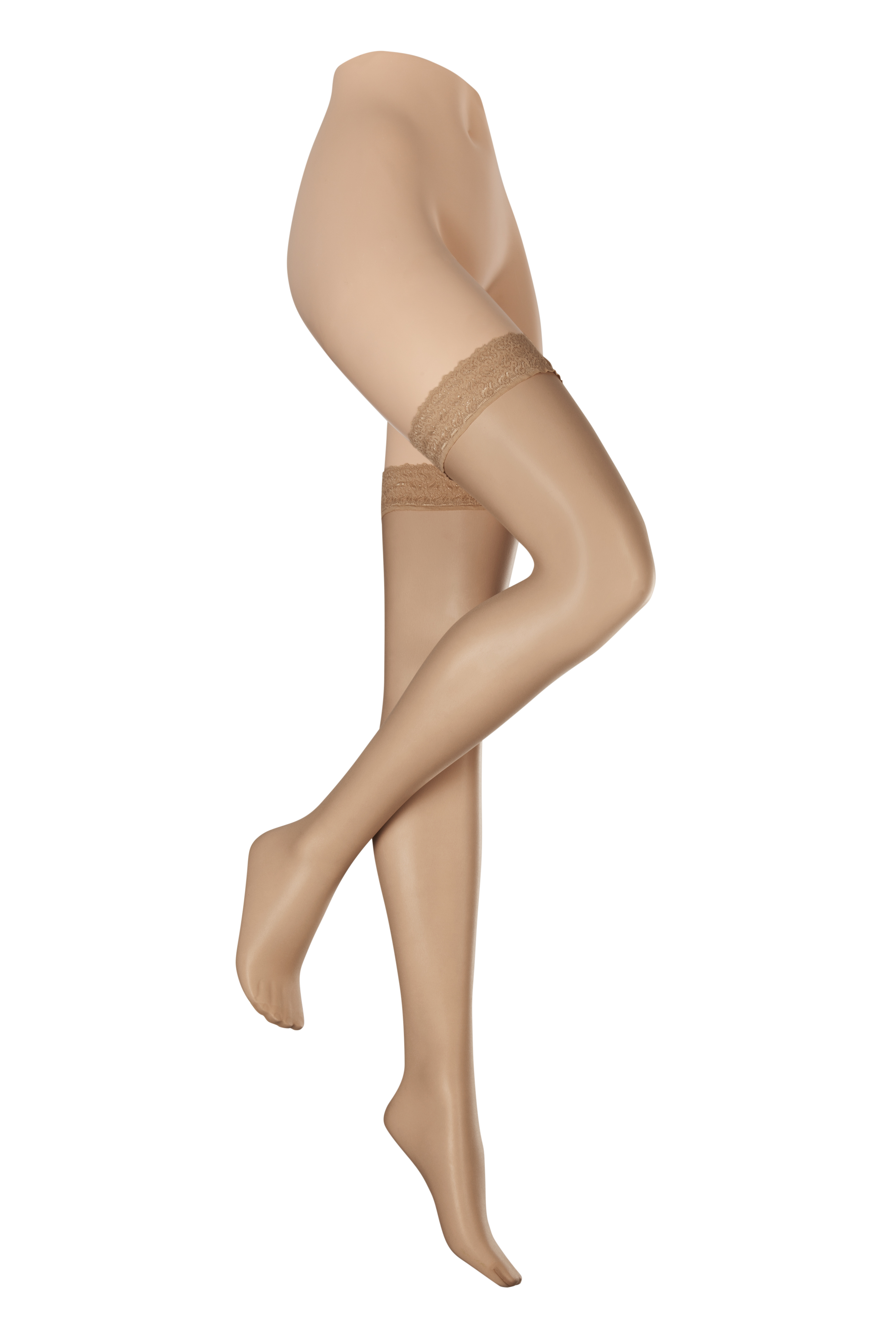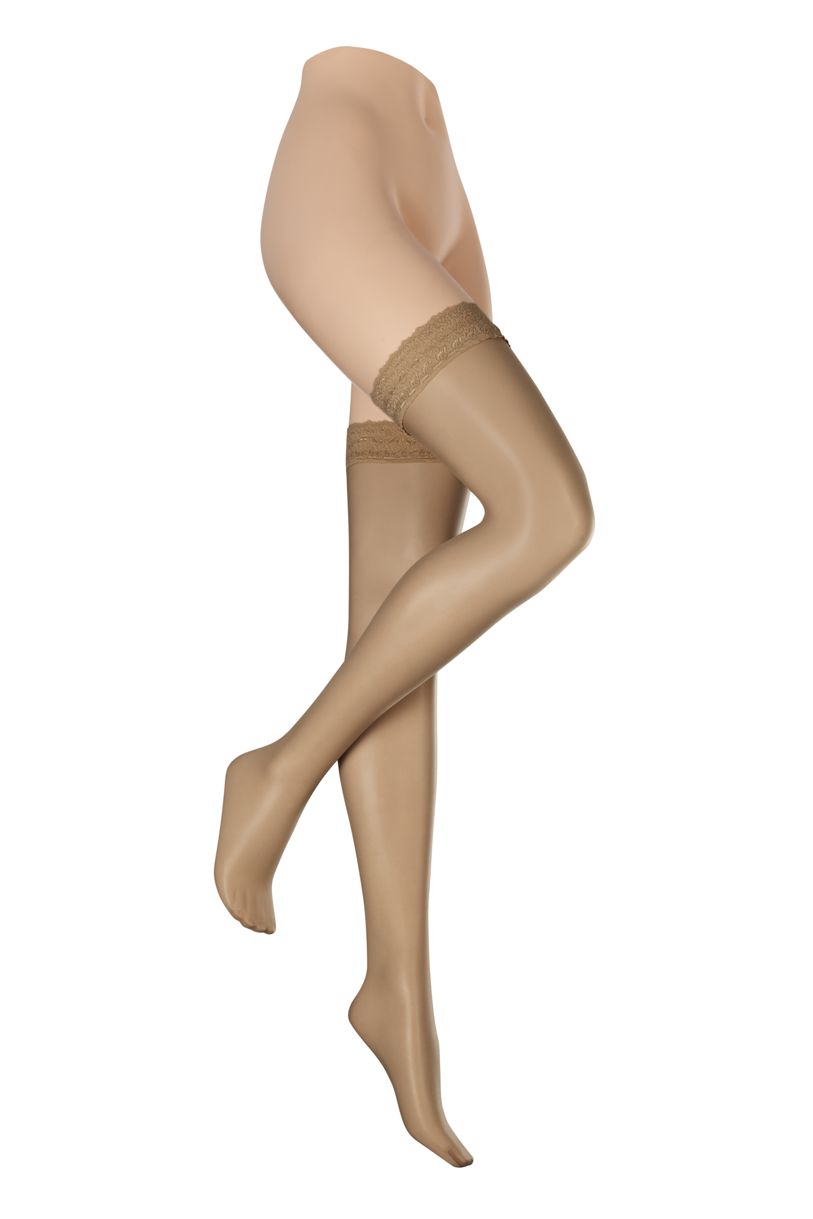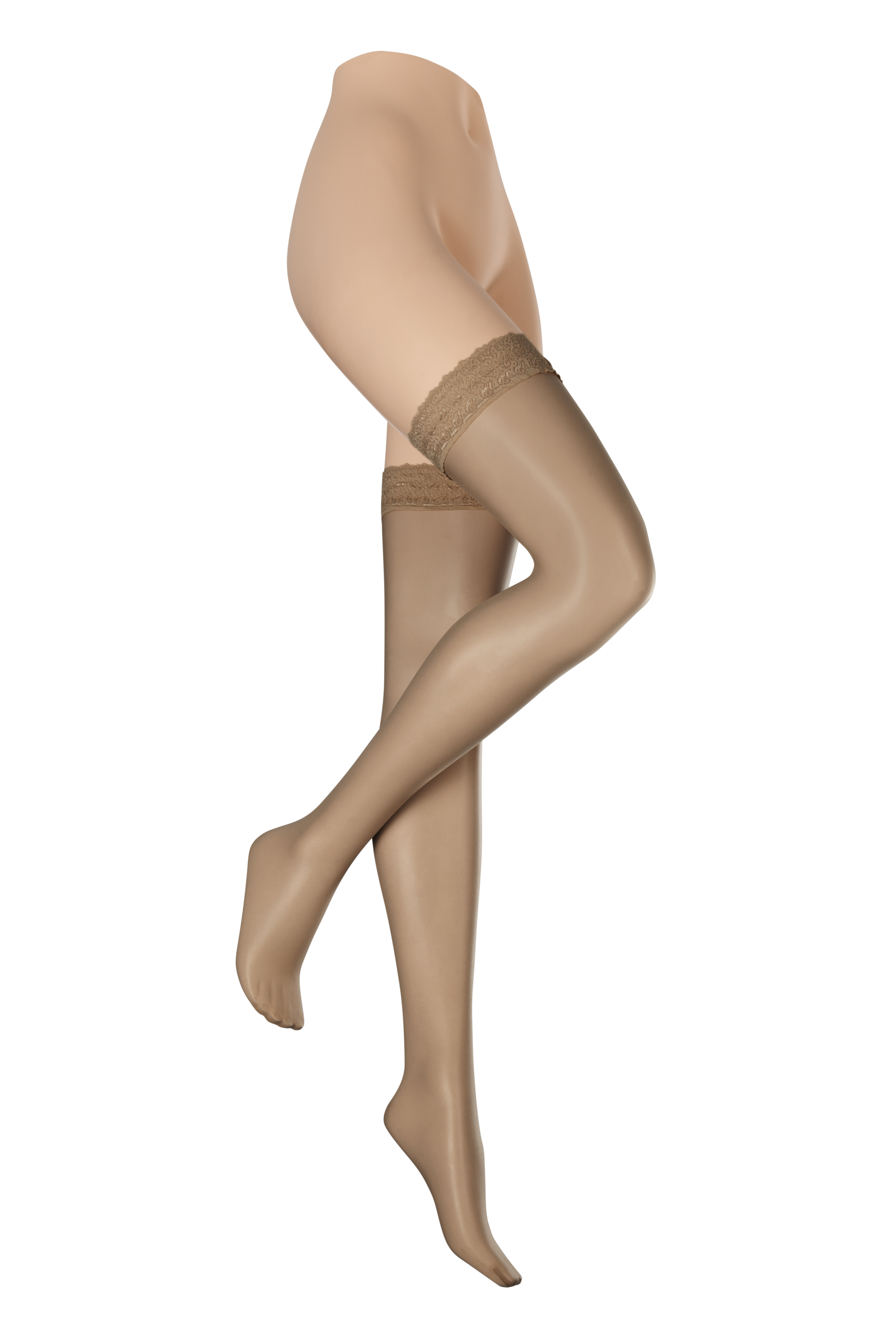 Ultra caurspīdīgas matētas vasaras pašpieturošās zeķes - Ideāls nūde izskats jūsu kājām. Modes mežģīņu josla ar dubultām silikona lentēm, sandales purngals. 14 den