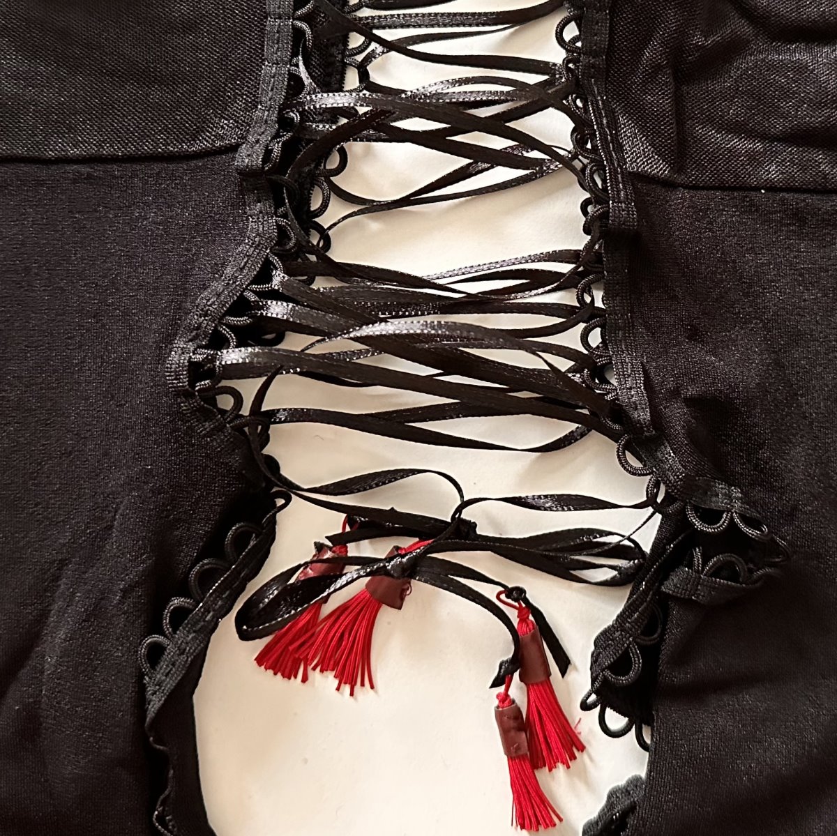 Sensuous opaque tights with open crotch and seductive lacing on the front and back side. With comfortable waistband. 100 denier