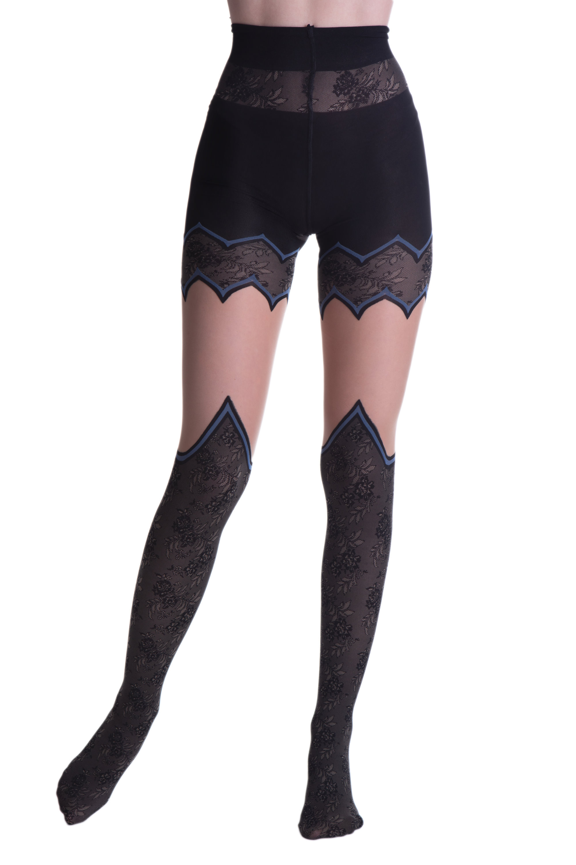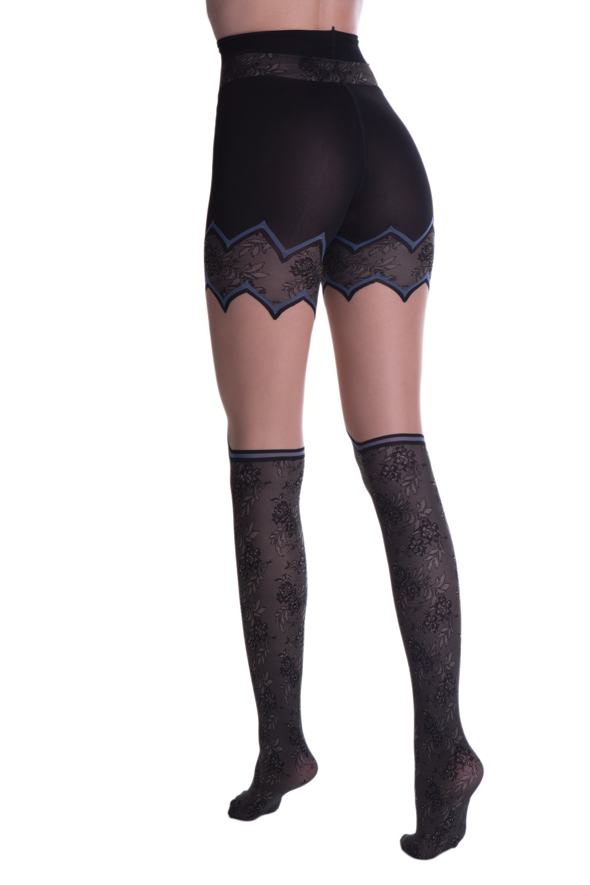 Ne caurspīdīgas zeķubikses ar virsceļgalu zeķu efektu un skaistu puķu rakstu, kā arī mežģīņu dizainu biksīšu daļā. Ļoti īpašs izstrādājums visiem, kas mīl detaļas.