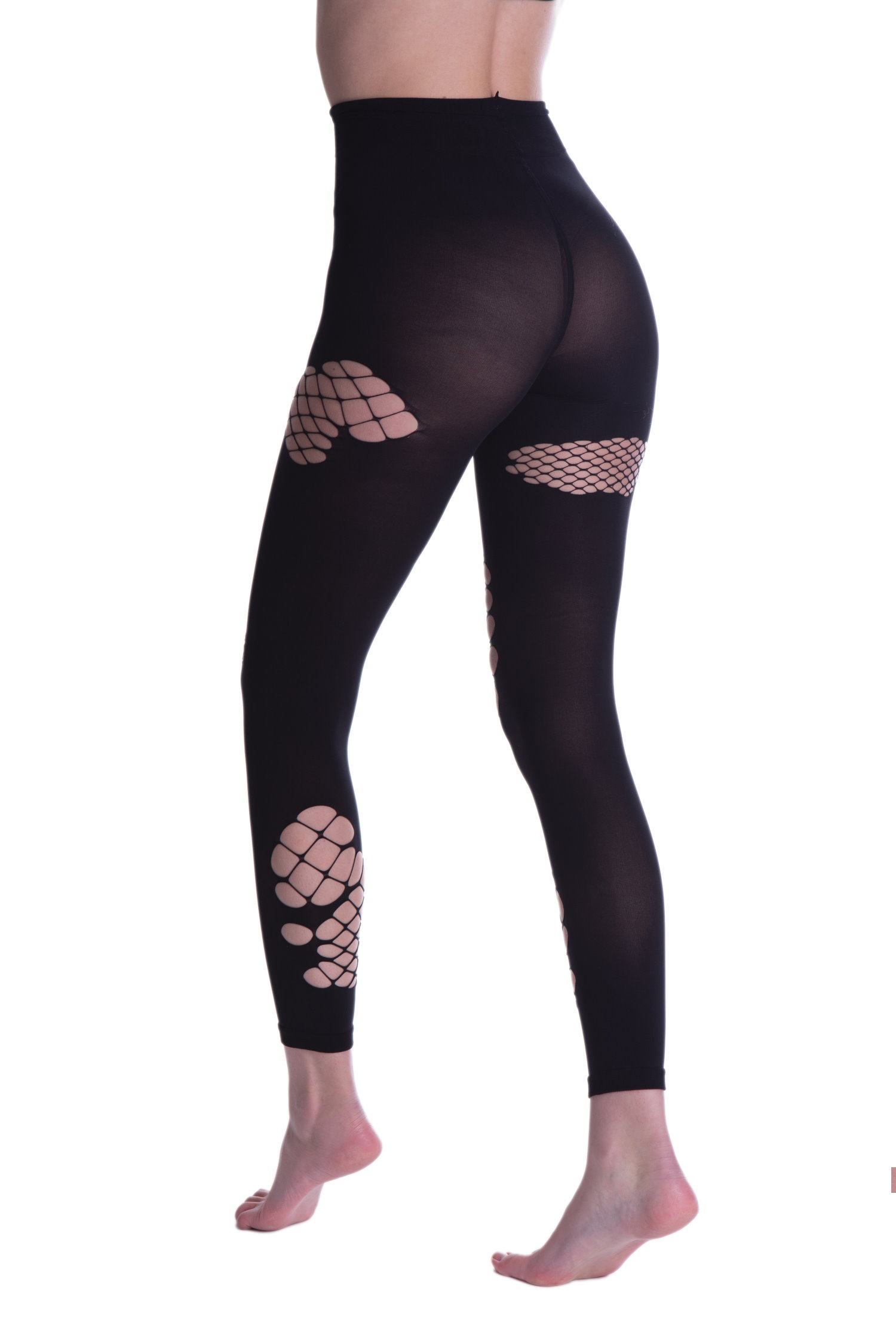 Trendy nēsātas izskata legingi ar tīkliņzeķubikšu detaļām. Jauns un dinamiskas modelis ielas modes izskatam.